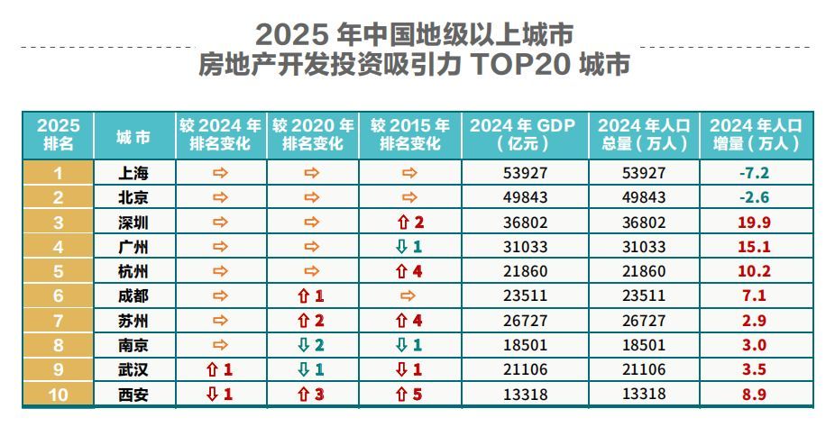二线城市中,杭州、成都表现突出,稳居二线前两位。其中,杭州近年来在人工智能等领域发展迅猛,吸引了大量科技企业和创新人才,2024年人口增量为10.2万人,房地产开发投资吸引力自2018年以来一直稳居全国第5位;成都作为西南地区的经济中心,电子信息、生物医药、航空航天等高新技术产业蓬勃发展,投资吸引力排名全国第6位。 “一二线核心城市凭借坚实的经济基础与产业竞争优势,持续吸引高质量人才流入,为房地产市场提供了有利支撑。”曹晶晶表示。 人口流向主导供需 人口作为住房需求的基础和劳动力供给的核心要素,其变动趋势对房地产市场影响深远。尽管多数城市人口增长趋缓,但核心城市的人口吸引力依然突出。 近两年,国家在房地产发展新模式中提出要建立“人、房、地、钱”要素联动机制,以人定房、以房定地、以房定钱,即根据人口变化,合理确定住房需求,科学安排土地供应,引导配置金融资源。 “由此可见,人口既是研判城市住房需求的基础,也是各地统筹配置土地、资金等要素资源的重要依据。”曹晶晶表示。 从2024年数据来看,城市间也存在着较大差异。一线城市中广州、深圳人口保持正增长,其中深圳增长近20万人,广州增长15.1万人,而北京、上海人口由增转降;中西部省会城市中,贵阳、长沙、南昌、西安、郑州、成都等地持续保持较强吸附力。 “好城市 好房子”价值凸显 不同城市之间的经济水平和购买力差异明显,长三角、珠三角等区域居民购买力保持稳定增长,对改善性需求主导的新房市场具备较强支撑。 2024年,我国GDP万亿城市数量达到27个,经济总量占全国的比重达40.9%,上海成为全国首个经济总量超过5万亿元的城市,城镇居民人均可支配收入超9.3万元。 体现在豪宅产品购买力上,2025年上半年,上海在全国高端住宅市场中占据主导地位,总价3000万元以上新房成交1096套,占30城总量的59.4%;而在全国成交总价5000万元以上的住宅中,上海占比更是接近八成。 在居民对高品质住房需求不断增加的背景下,“好城市 好房子”的价值将逐步兑现。“2025年,‘好房子’首次被写入《政府工作报告》,提出要完善标准规范,推动建设安全、舒适、绿色、智慧的‘好房子’,体现出政府对于‘好房子’建设的高度重视。”曹晶晶表示。 在她看来,在房地产企业转型升级的背景下,“好房子”建设为企业开辟了产业转型发展的新赛道。 房企应紧抓用户真实需求,聚焦居者实际体验,做好精准定位,针对不同客群需求特征细化产品线。同时,运用数字化工具、新型建造技术等方式来提高开发效率。此外,“好房子”需要“好服务”来维护,房企要围绕项目交付“前、中、后”全周期打造品质闭环,提升长期居住体验与企业品牌价值。 “只有真正具备‘好城市、好地段、好产品’特质的房产,才更能抵御风险,穿越市场周期。”曹晶晶认为。 |