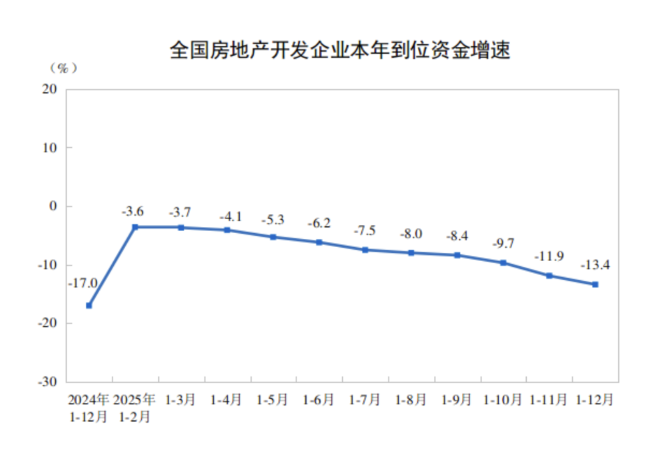 此外,国家统计局数据显示,2025年,房地产开发企业到位资金93117亿元,比上年下降13.4%。其中,国内贷款14094亿元,下降7.3%;利用外资25亿元,下降20.8%;自筹资金33149亿元,下降12.2%;定金及预收款28089亿元,下降16.2%;个人按揭贷款12852亿元,下降17.8%。