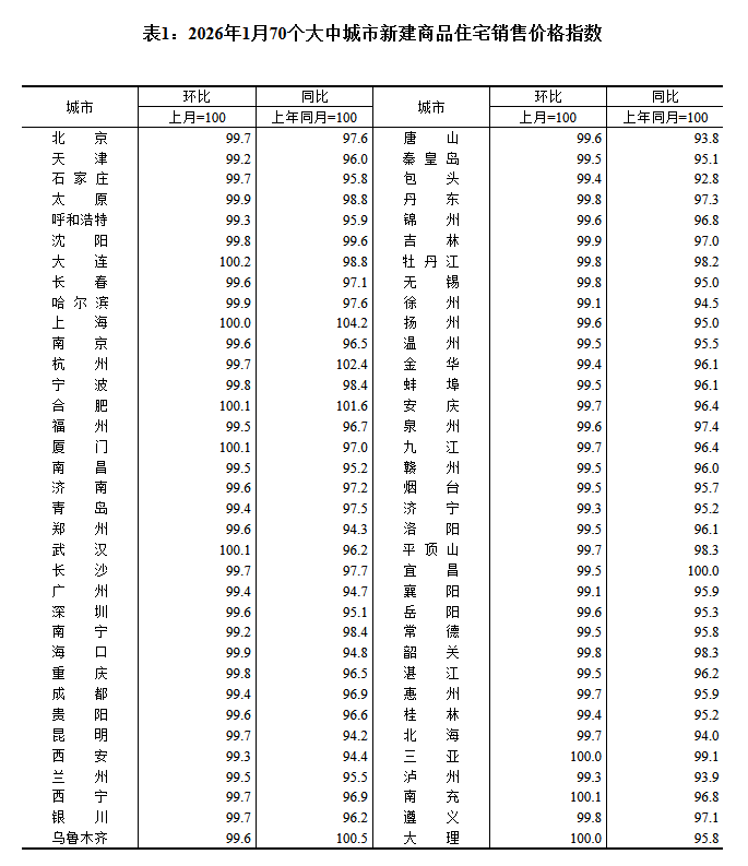 根据国家统计局数据,1月70个大中城市新建商品住宅销售价格环比上涨城市有5个,比上月减少1个,3个城市环比持平;同比上涨城市有4个,比上月减少1个,1个城市环比持平。
