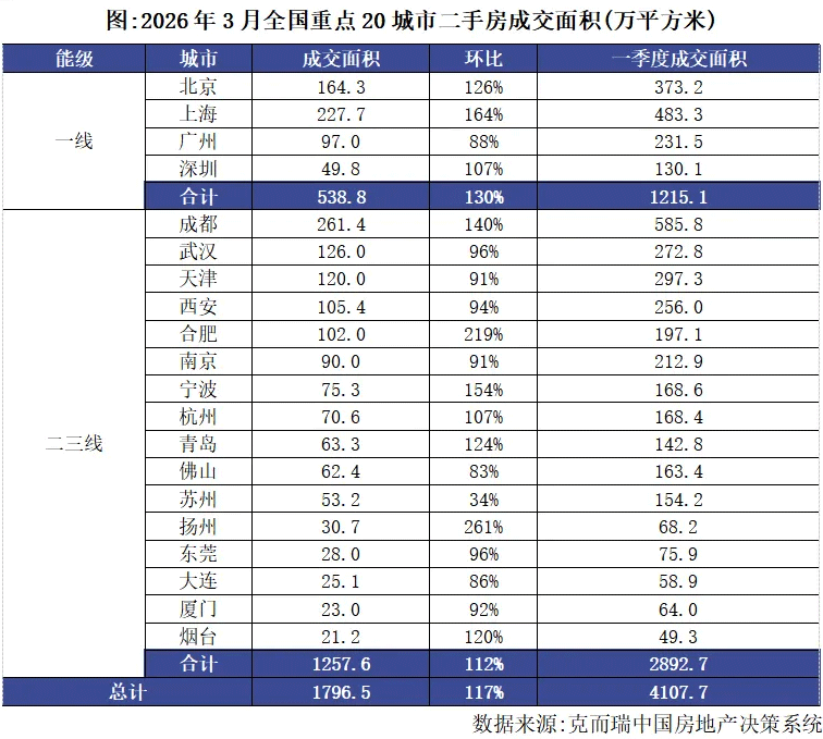 数据显示,3月份全国重点20城市二手房成交面积约1797万平方米,环比倍增117%,同比增长6%。一季度累计成交面积约4108万平方米,同比正增长4%。