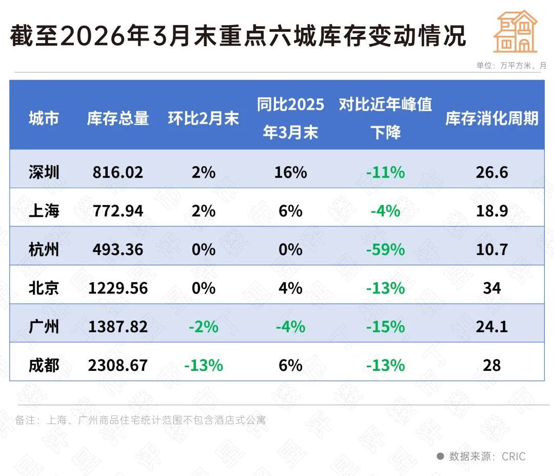 上述六城中广州库存去化表现亮眼,截至3月末,广州商品住宅存量规模1388万平方米,对比2025年末下降了51万㎡,整体去化周期24.1个月,对比2025年末缩短了0.7个月,库存压力稳步缓解。